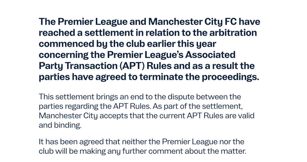 根据协议,曼城接受了英超关于APT的规定,并承认这些规则合法且具有约束力。英超与曼城俱乐部在一份联合声明中表示,双方将不再就此事发表进一步评论。