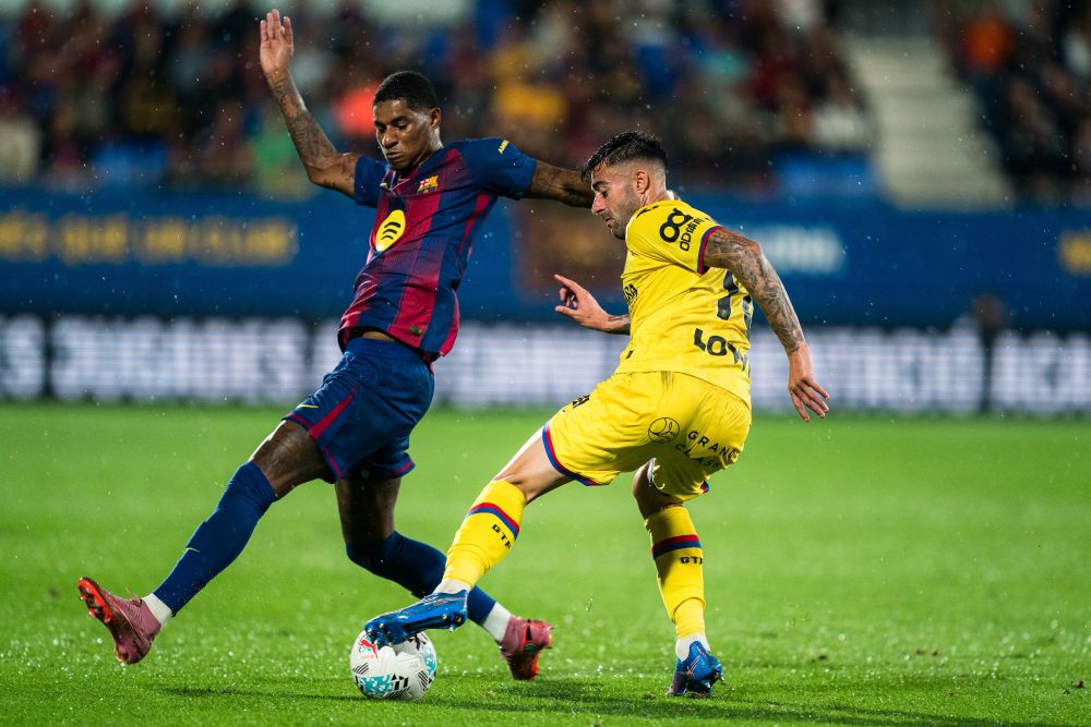 9月21日,巴塞罗那队球员拉什福德(左)与赫塔菲队球员桑克里斯在比赛中拼抢。新华社发(胡安·戈萨摄)